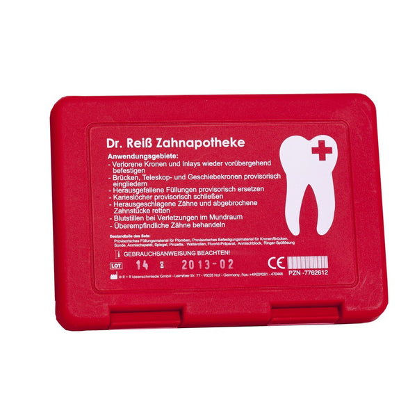 Extensive dental emergency kit for your travel. Intended for first aid in emergencies when no doctor is available. Therefore, the ideal equipment for expeditions and trips abroad. With this set you can reinsert crowns and bridges that have fallen out, stop bleeding, replace fillings, treat hypersensitive and/or carious teeth, store broken teeth for reinstatement (with the new toothsavngbox up to 24 h). This set does not replace the dentist but helps you to master and to bridge the most unpleasant consequences of a dental accident.