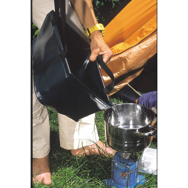 A strong, folding bowl of double-sided coated polyester.High-frequency welded seams and 100% waterproof. With 2 handles for transporting water - washing-up bowl, portable washing machine, feeding bowl for dogs or horses, mini-swimming pool or fruit bowl. Remarkably flexible and, in the meantime, standard equipment for camping and the great outdoors. Presentation display available for the 5 and 10 litres versions.